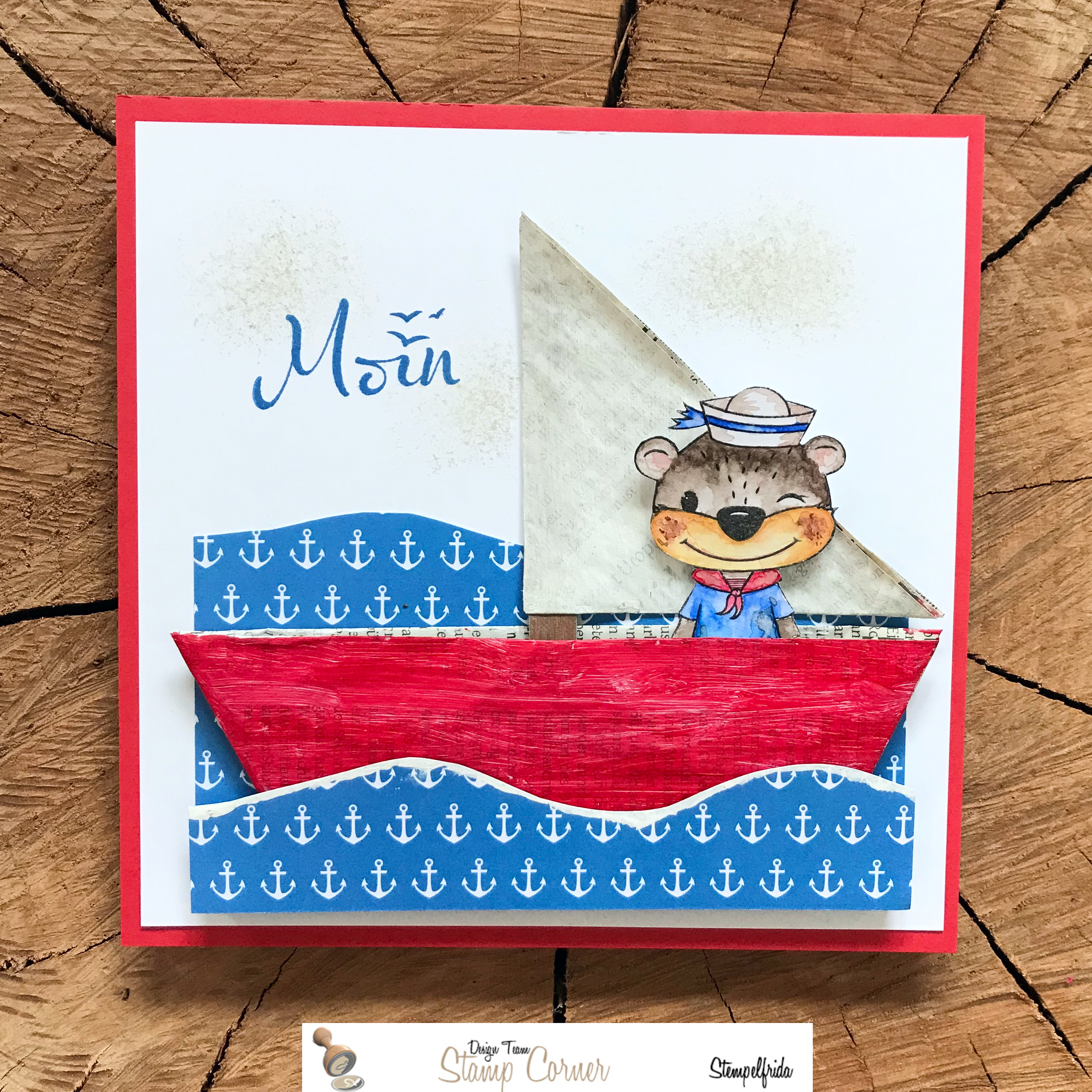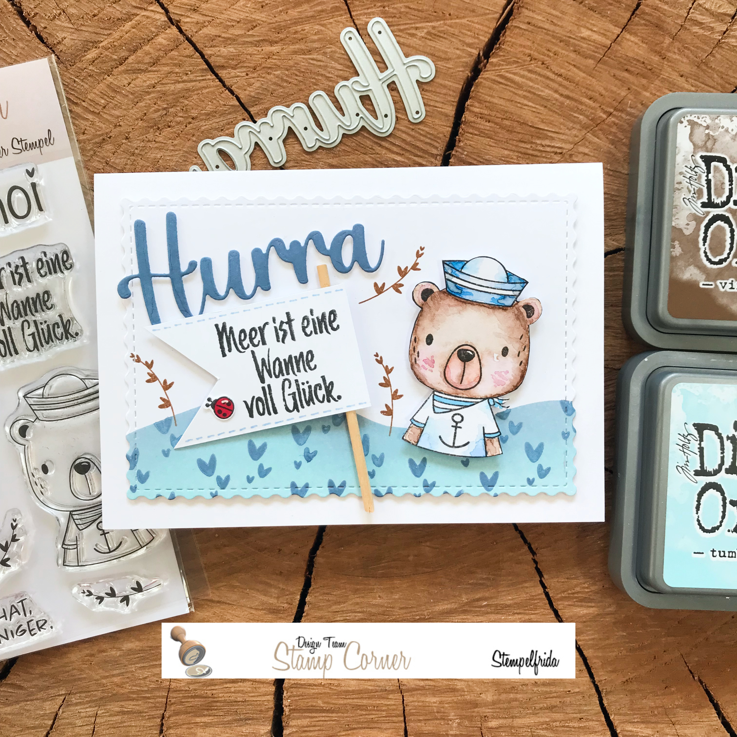 Very soon there is a new release from Stamp Corner, which also contains a stamp set designed by GroWi design. It has this cute bear, the hearts, twigs and the saying, which I used on my card. The saying says: The ocean is a pool of luck. There will also be this new die in the release saying "horay"!